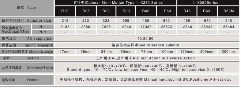 1-X280系列直行程氣動薄膜執行機構,采用多彈簧式結構,分為正作用和反作用兩種形式,依靠彈簧復位可輕松實現閥門要求故障位置,其與直行程閥類組合,主要用于過程參數的控制與調節,最大行程可達76mm,具有重量輕、推力大、結構簡單等特點,是一種高性能的氣動執行機構,并申請國家發明專利—種重載型氣動薄膜執行機構/專利號:ZL 2015 10215424.4